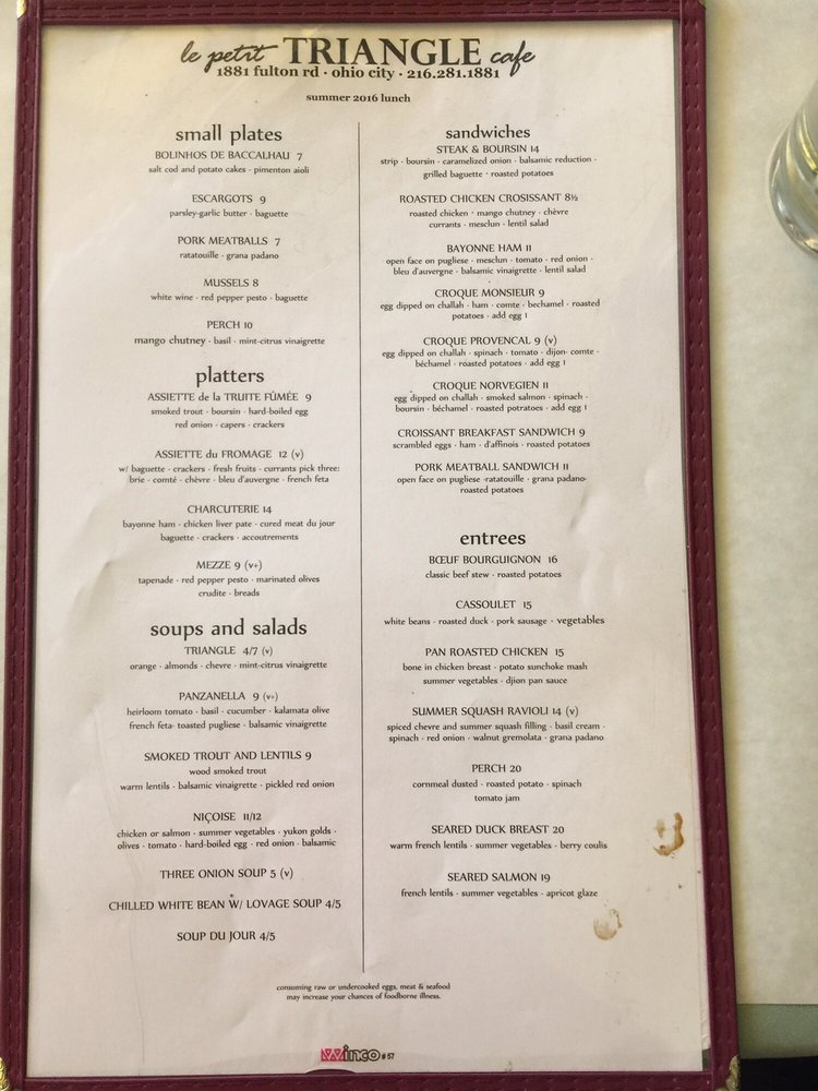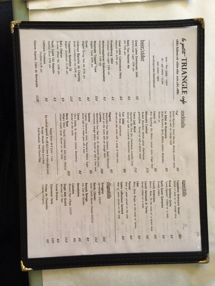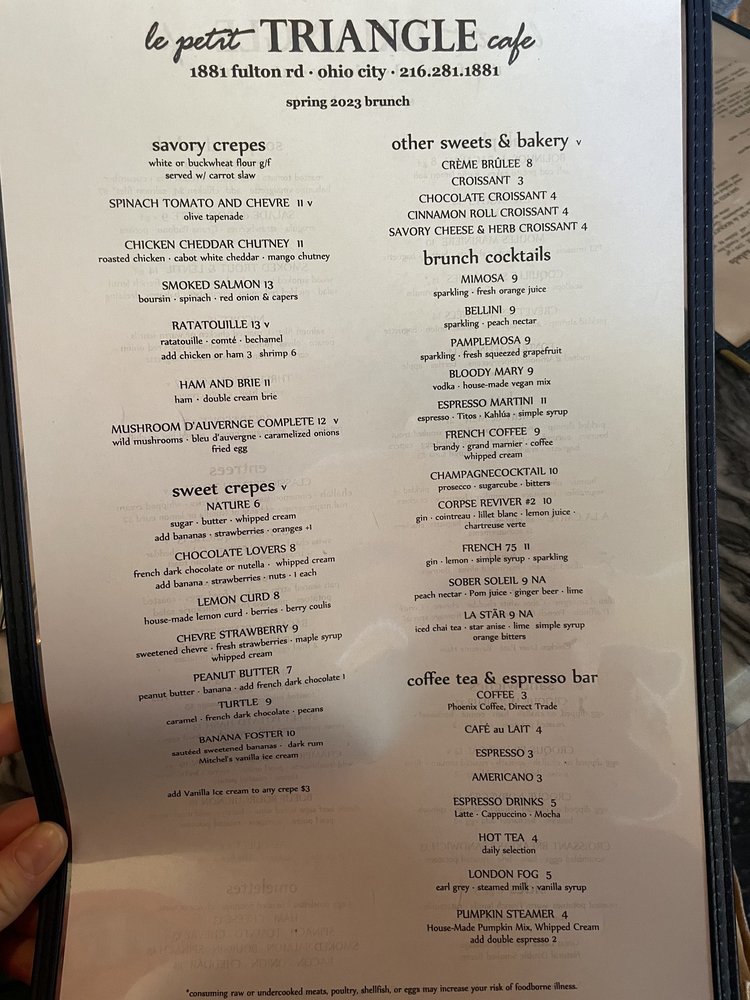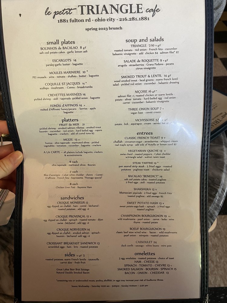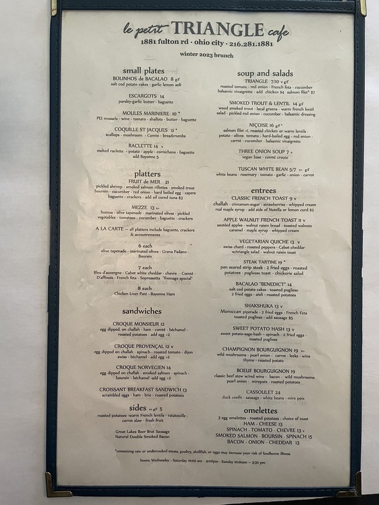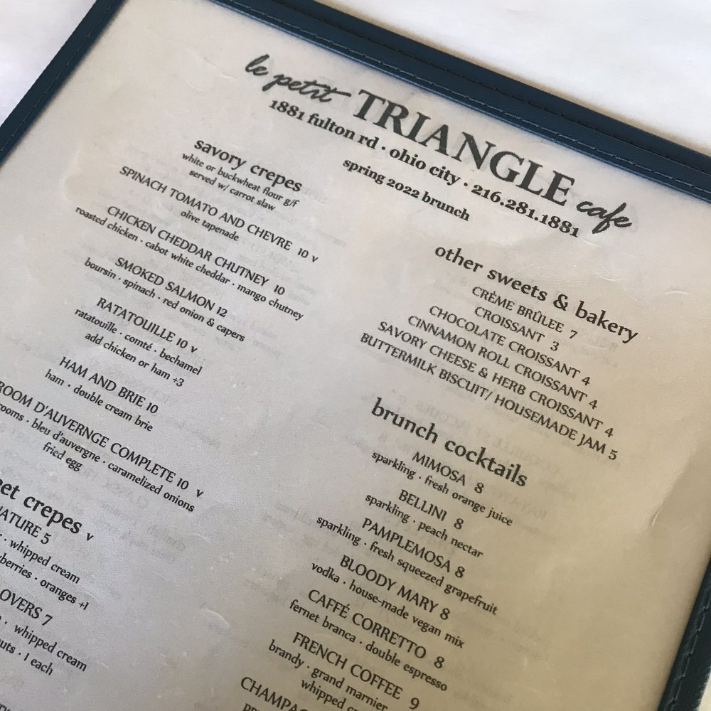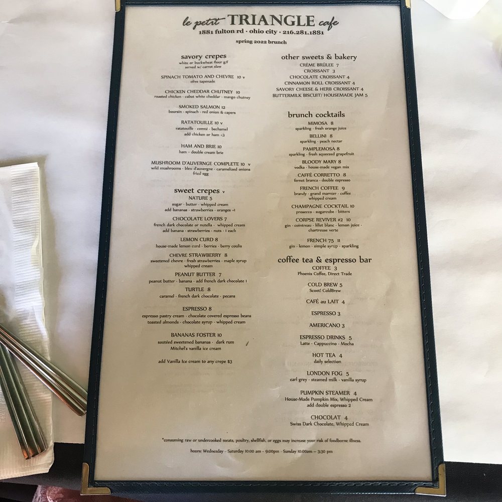 Le Petit Triangle Cafe is a charming French cafe in Cleveland, OH that offers a variety of dishes for breakfast and brunch. The menu features a range of non-alcoholic drinks, including iced tea, San Pellegrino beverages, and specialty coffees like lattes and mochas. Their brunch cocktails, like mimosas and bellinis, are perfect for starting your day off right. The intimate setting with outdoor seating and free Wi-Fi makes it a great spot for groups or a relaxing solo meal. The cafe also caters to vegans and vegetarians with many options available. Whether you're looking for a quick bite or a leisurely brunch experience, Le Petit Triangle Cafe has something for everyone. The attention to detail in the dishes and the cozy atmosphere make this cafe a must-visit in the Cleveland area.